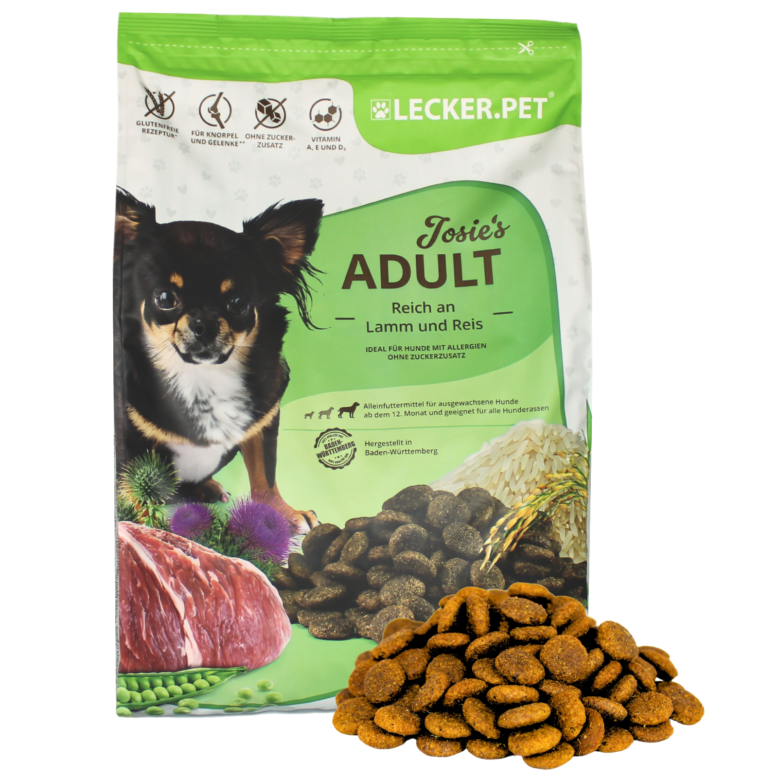 Das Adult Lamm & Reis Trockenfutter ist eine ausgewogene und schmackhafte Mahlzeit für erwachsene Hunde, die besonderen Wert auf eine hochverdauliche Ernährung legen. Der hohe Anteil an Reis (16 %) sorgt für eine leicht verdauliche Kohlenhydratquelle, während bewusst auf Weizen verzichtet wird, um die Verträglichkeit zu erhöhen.