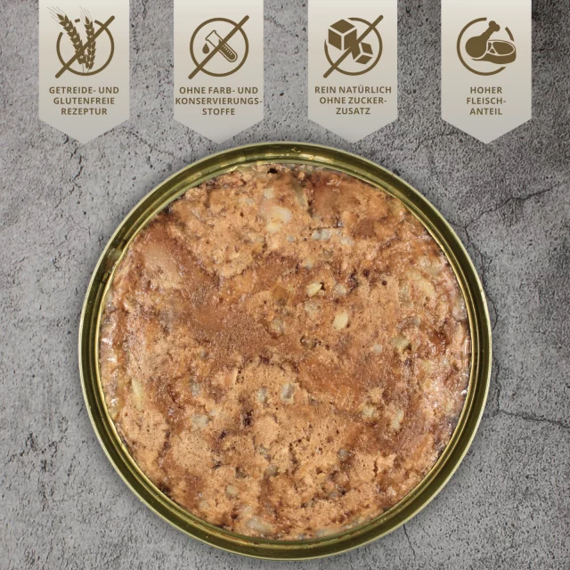Grundsätzlich ist unser 100% Futter aber für Hunde ab dem 12. Monat und alle Rassen geeignet. Die Rezeptur ist getreidefrei und frei von Zuckerzusätzen.