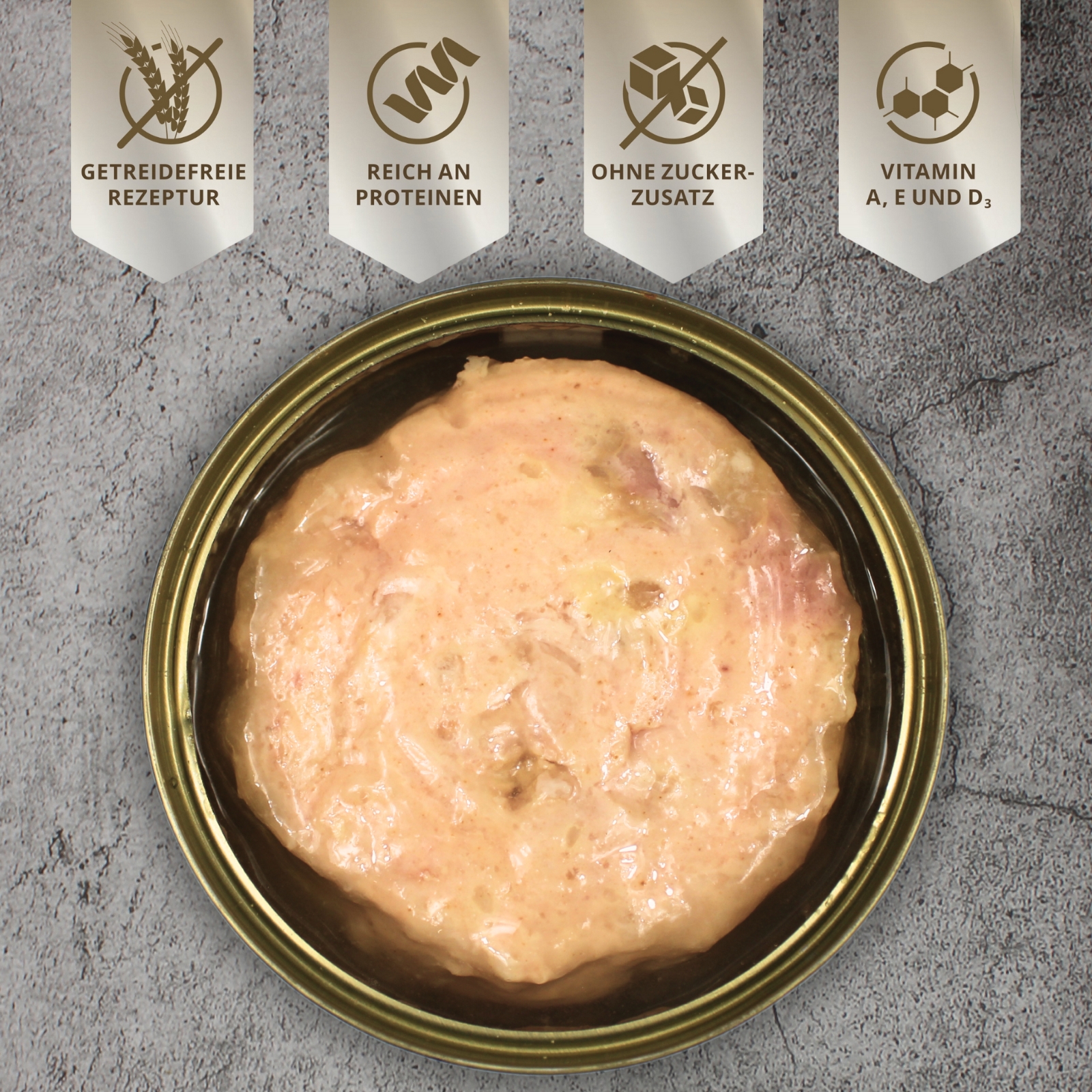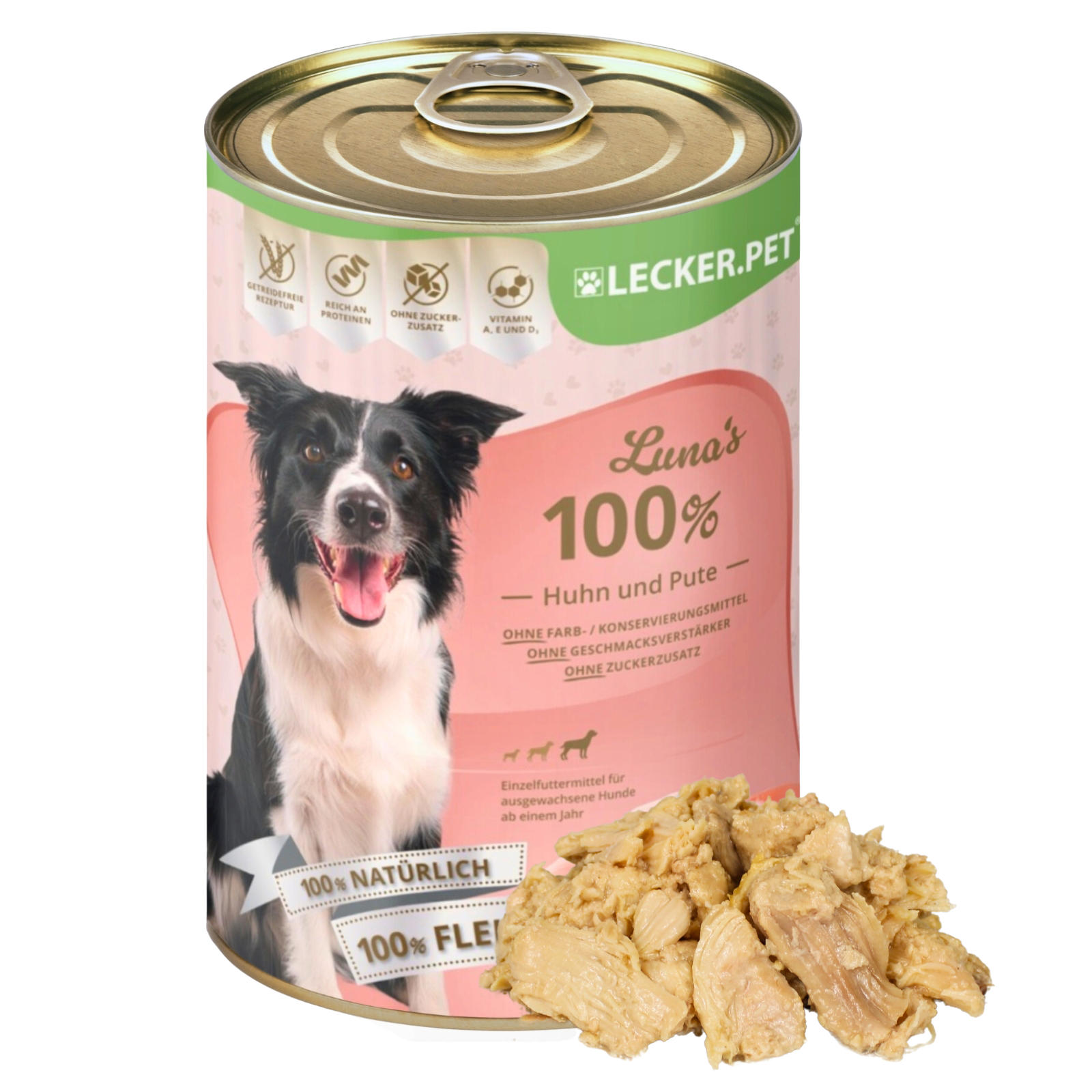 Luna’s 100% Nassfutter besteht aus hochwertigem Hühner- und Putenmuskelfleisch. Dieses ist sehr nährstoffreich und enthält unter anderem Eisen, Magnesium, Kalzium und Natrium, aber auch essentielle Aminosäuren. Diese Nährstoffbombe trägt nicht nur zur normalen Funktion der Organe und Muskeln bei, sondern verleiht auch ein schönes Fell.